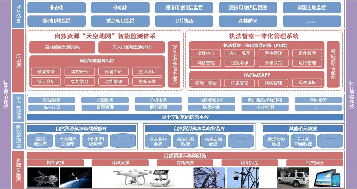 執(zhí)法督察解決方案主要包括“天空地網(wǎng)”智能監(jiān)測體系和執(zhí)法督察一體化監(jiān)管系統(tǒng)兩部分。