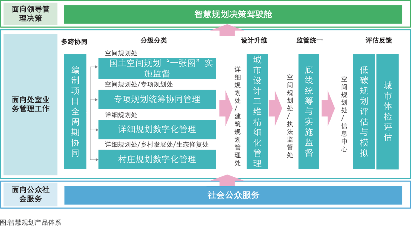 面向國(guó)土空間總體規(guī)劃、專(zhuān)項(xiàng)規(guī)劃、詳細(xì)規(guī)劃、村莊規(guī)劃、城市設(shè)計(jì)在內(nèi)的國(guó)土空間規(guī)劃體系,以三維立體國(guó)土空間規(guī)劃一張圖”為基礎(chǔ),建立“多規(guī)合一 ”“多級(jí)傳導(dǎo)”“多維賦能”的智慧規(guī)劃全周期管理應(yīng)用體系:縱向上支撐由上級(jí)到地方、由總規(guī)到詳規(guī)、由規(guī)劃到設(shè)計(jì)、由計(jì)劃到實(shí)施、由二維到三維的有效傳導(dǎo)、多維管控與動(dòng)態(tài)反饋;橫向上覆蓋規(guī)劃設(shè)計(jì)的編制(修改)、審批、實(shí)施、監(jiān)督、評(píng)估、公眾參與等全周期管理過(guò)程,以及政府、市場(chǎng)、社會(huì)多主體,形成分級(jí)分類(lèi)型的規(guī)劃全過(guò)程數(shù)字化決策鏈,結(jié)合領(lǐng)導(dǎo)駕駛艙的信息匯集分析展示,為實(shí)現(xiàn)“可感知、能學(xué)習(xí)、普治理、自適應(yīng)”的智慧國(guó)土空間規(guī)劃提供技術(shù)支撐。