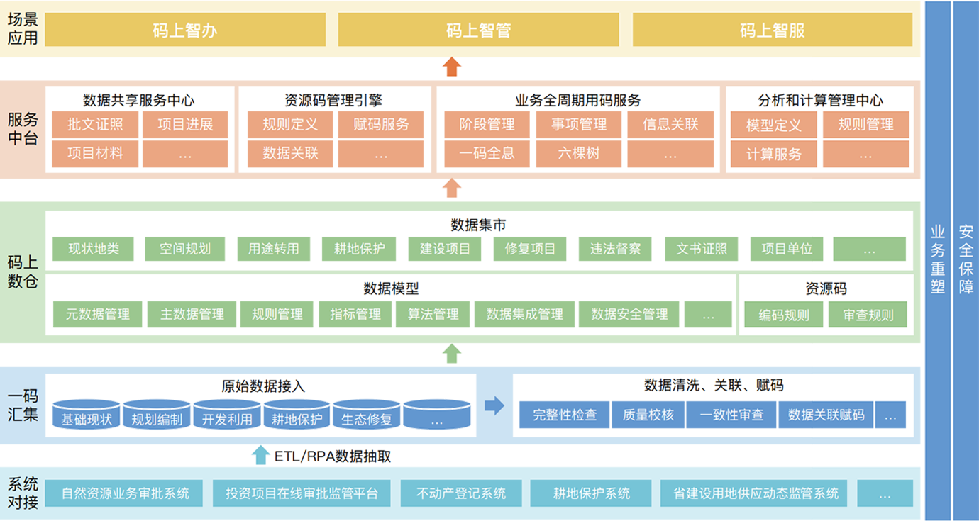 圍繞“整體智治”理念,以“空間碼”貫穿“現(xiàn)狀調(diào)查、規(guī)劃編制、前期策劃、用地報批、土地征收、土地供應(yīng)、工程建設(shè)、竣工驗收、確權(quán)登記”全過程,各階段涉及的業(yè)務(wù)信息、文書材料、空間圖形等成果數(shù)據(jù)均通過“空間碼”歸集到“一地一碼”數(shù)據(jù)倉中,在此基礎(chǔ)上,構(gòu)建從編碼、賦碼到用碼的全方位的“一地一碼”業(yè)務(wù)協(xié)同應(yīng)用,推進“碼上智辦”、“碼上智管”、“碼上智服”等各類場景關(guān)聯(lián)集成,逐步實現(xiàn)全領(lǐng)域、全要素、全過程的“碼上智治”。